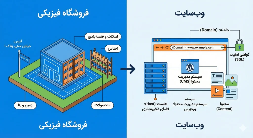 برای راه‌اندازی یک وب‌سایت، شما به مجموعه‌ای از ابزارها و زیرساخت‌ها نیاز دارید که هر کدام نقش خاصی در نمایش سایت شما به کاربران ایفا می‌کنند. می‌توان این فرآیند را به تاسیس یک فروشگاه فیزیکی تشبیه کرد تا درک آن ساده‌تر شود. در ادامه، یک مقاله کامل و ساختاریافته در پاسخ به درخواست شما آماده شده است: