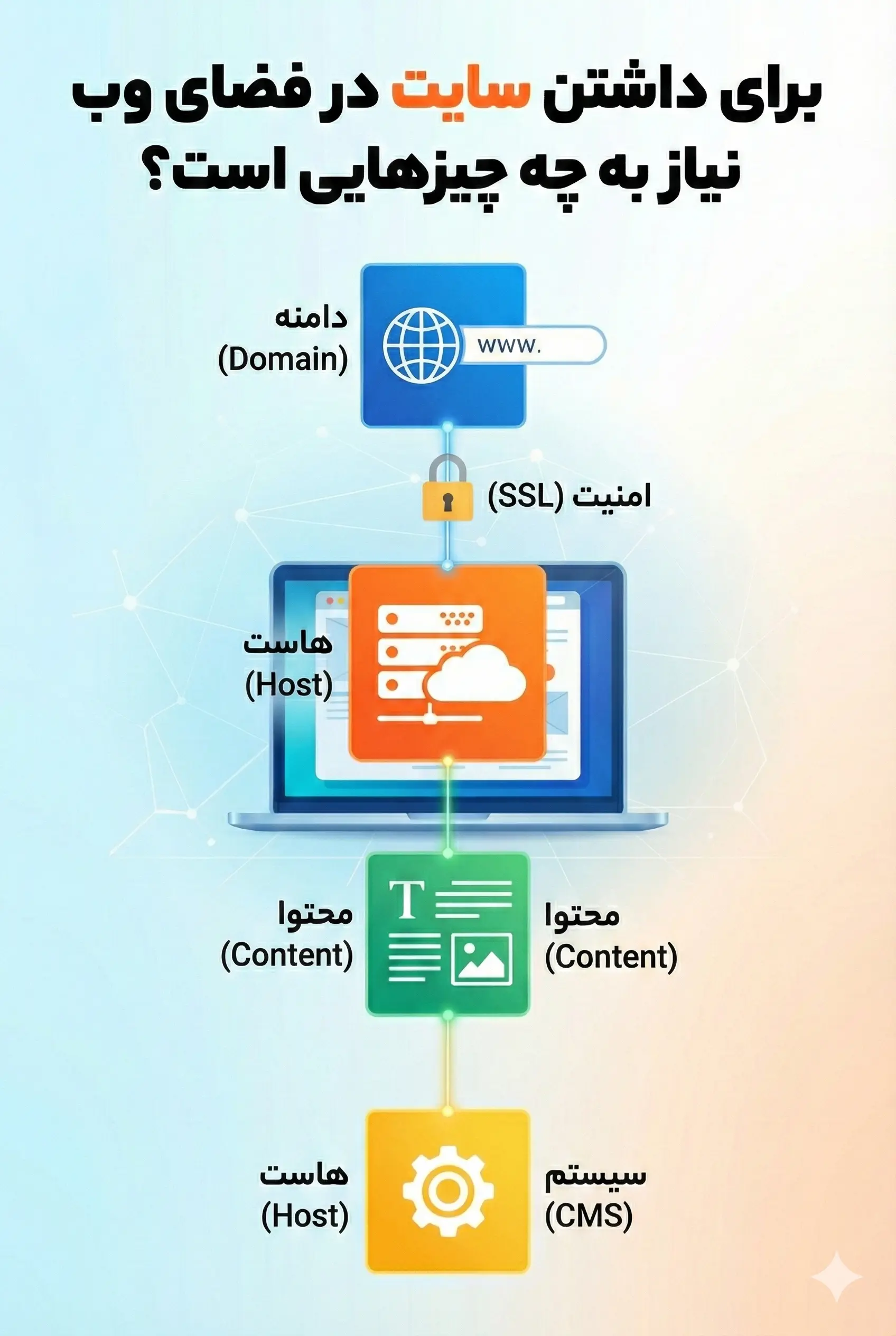 برای اینکه یک سایت در اینترنت قابل مشاهده باشد، به ۴ رکن اصلی نیاز دارید: دامنه (آدرس)، هاست (فضا)، سیستم مدیریت محتوا (سازه) و طراحی (دکوراسیون).